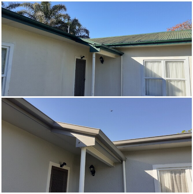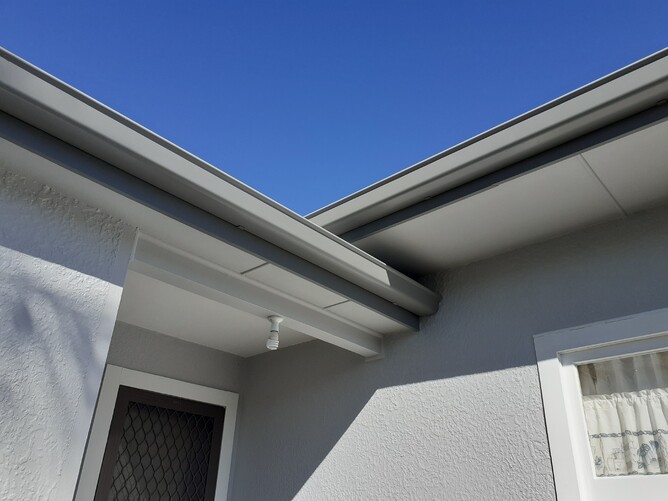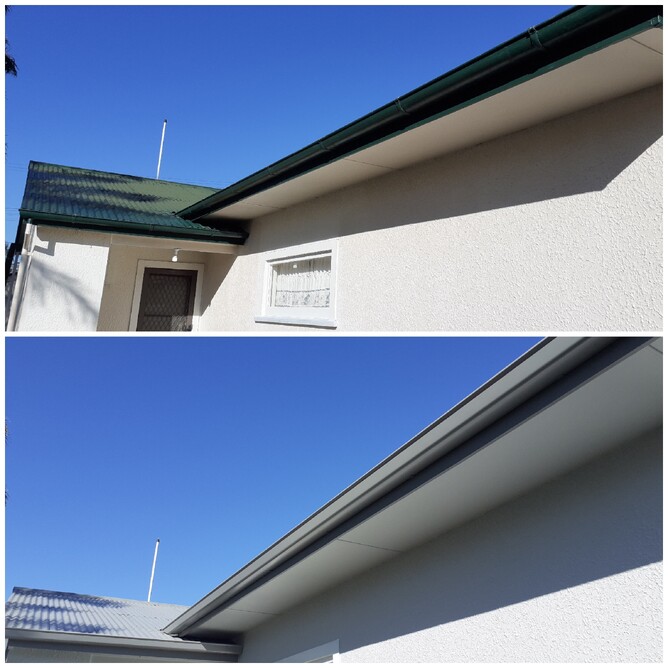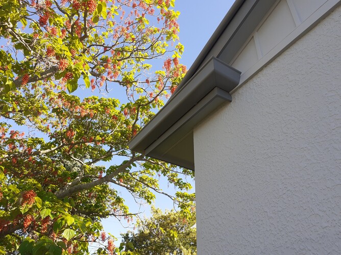 This home received a full colour makeover with Quarter Round Sandstone Grey COLORSTEEL® continuous spouting complementing the new house colour.
